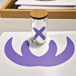 Stellen Sie sich auf die schwarzen Fußabdrücke und betrachten Sie die Abbildung auf dem Fußboden in der Spiegelsäule. Welche Formen erkennen Sie? Aus dieser Perspektive ergeben die Formen auf dem Boden ein sinnvolles Bild. So erscheinen Kurven als gerade Linien und amorphe Muster als geometrische Körper. Diese Zerrbilder, sogenannte Anamorphosen, werden speziell hergestellt und sind für einen ganz bestimmten Blickwinkel...